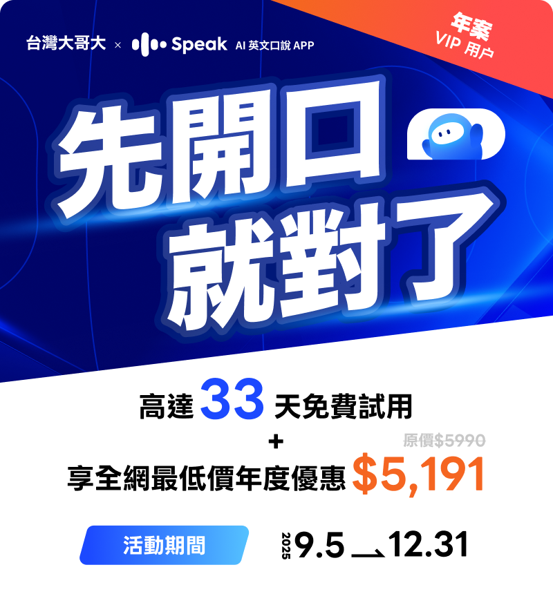 請放心,優惠內容與使用權益皆會依照本活動方案計算!季度方案訂閱者,結帳畫面與發票上可能會顯示為「年度訂閱」,請放心,實際權益為 90 天使用期,不會影響你的體驗與權益,且在這期間都可以隨時取消。Speak 會依照本次活動方案為你提供完整權益,請安心體驗!