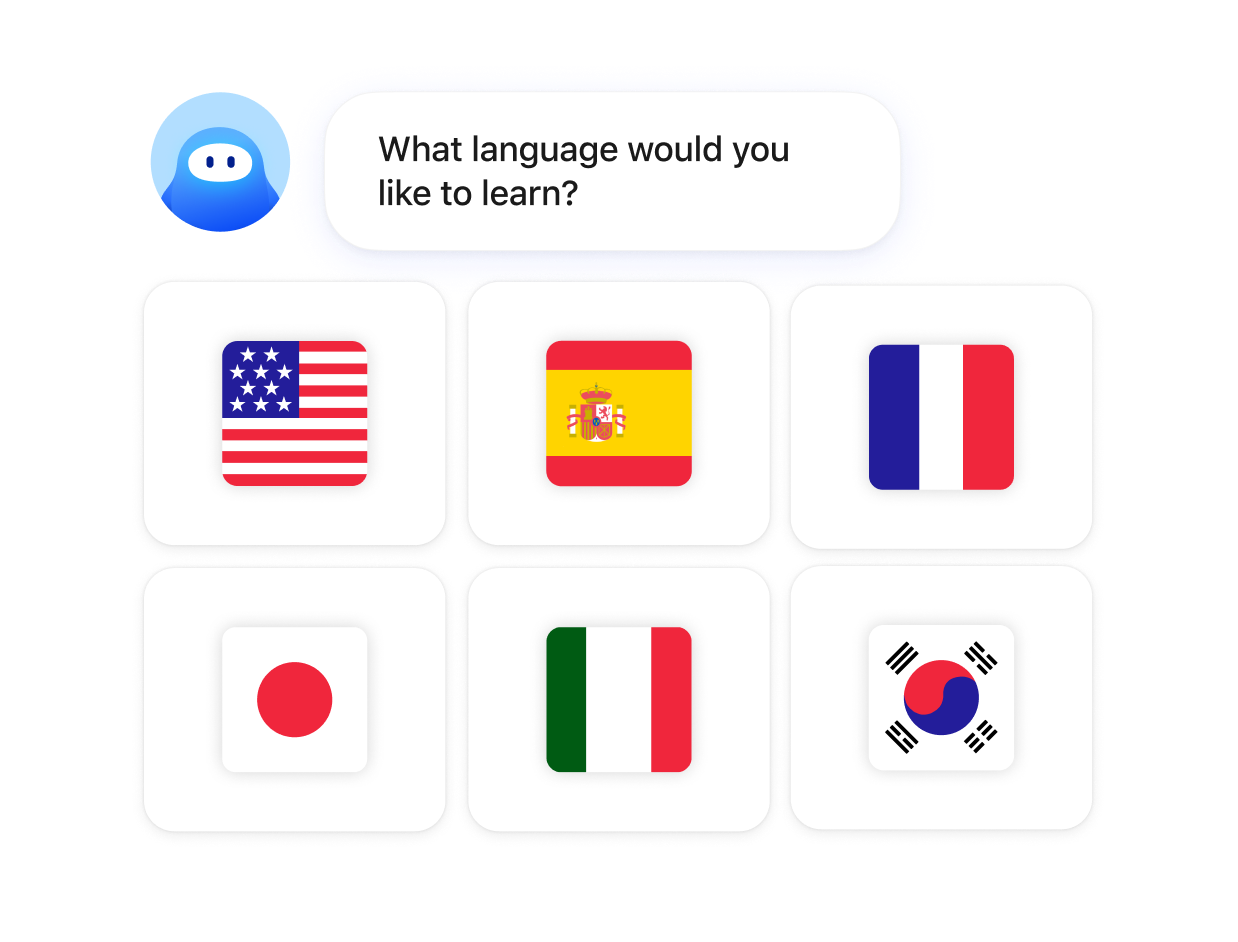 Learn Spanish, English, French, Italian, Japanese, or Korean. Switch between languages anytime and progress at your own pace.